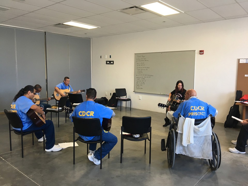 It is a themed small group songwriting experience for non-musicians and musicians alike. It is meant to open a space for each person to tap into their own creative source and facilitate growth, healing, and connection within the process of songwriting. Music has saved my life time and again and has really been an other worldy experience since the first moment I began songwriting at about age 12. Somewhere along the way, I realized in my heart that I wanted to share the profound nature of the process with others and give back through music. I’ve explored various ways of doing this, but when I started working with Jail Guitar Doors to facilitate a rehabilitative songwriting workshop at Donovan State Prison, things really came into perspective and I was able to hone in on an approach that could translate well within any scenario.