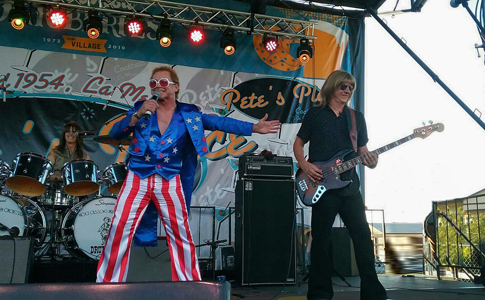 Kenny Metcalf (A Tribute to Elton John): During my second year at the OC Fair, we up’d the show with ramps to stage platforms to run up and down on. I was singing while coming down the ramp and the ramp blended into the stage and I was about a foot off the stage when I stepped and missed the ramp, dropping me to the floor with my butt landing onto the ramp. The rest of me decided, since I was there, to lay back on the ramp and keep singing. As I was getting up during the song, I realized I had torn my pants. So, I did a quick unplanned costume change and the band played until I returned. No one ever knew.