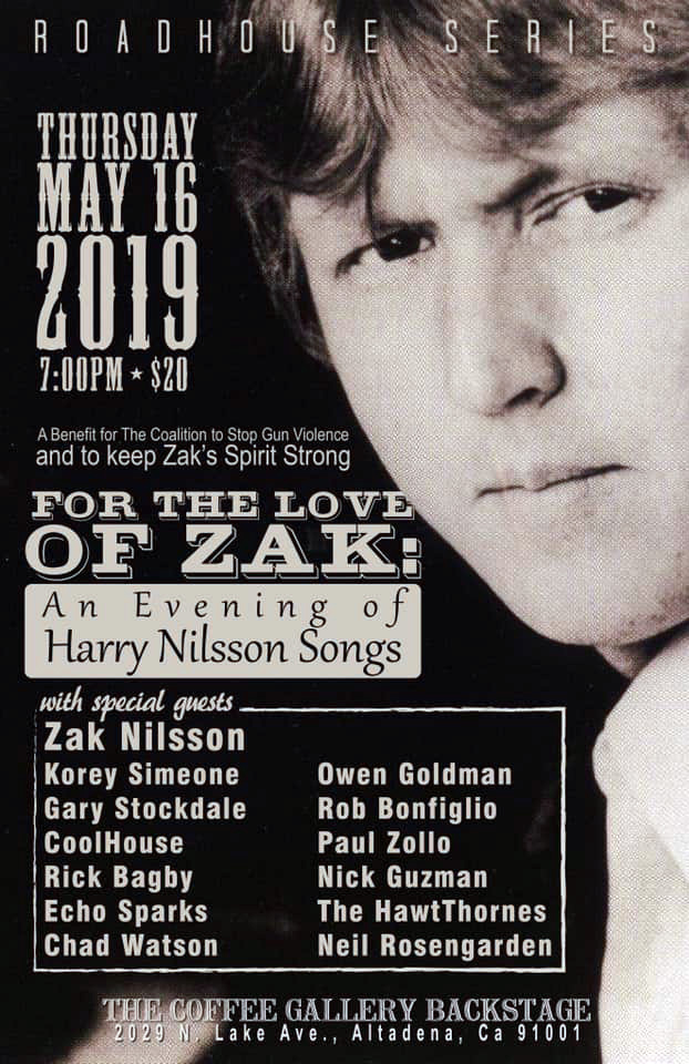 I was also honored to produce a benefit for Zak and a tribute to Harry after his diagnosis. It was held at Bob Stane’s Coffee Gallery Backstage and, at Zak’s request, proceeds went to The Coalition to Stop Gun Violence, which Harry supported after John Lennon’s murder. That night Zak performed “Cuddly Toy” and “Without Her,” with Nick Guzman, Chad Watson, and Beach Boy associate Rob Bonfiglio on guitar as well as Rick Bagby on keys and Owen Goldman on drums. His version of “Without Her” that night was sweet, touching, and vulnerable. It echoed the loss of his father throughout his life and foreshadowed our own sense of loss at the possible future of living in a world with Zak Nilsson. Earlier in the evening, hula student, Melinda Koshimizu, chanted, danced, and presented Zak with a homemade, handmade lei, which in Hawaiin culture, symbolizes love and royalty for the receiver. Certainly, Zak possessed both throughout his life.
