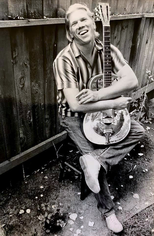 I first met Bruce sometime around 1982 or’83, shortly after he moved from Phoenix to San Diego. My first recollection of ever seeing him, was sitting on a chair in front of his little house off of North Park Way, long blond hair—like Gregg Allman’s—unbuttoned vintage Hawaiian shirt, and playing a vintage National Dobro. If my memory serves me right, he was having a yard sale, selling mostly vintage clothes, furniture, and accoutrements, which he did throughout the eighties and nineties.