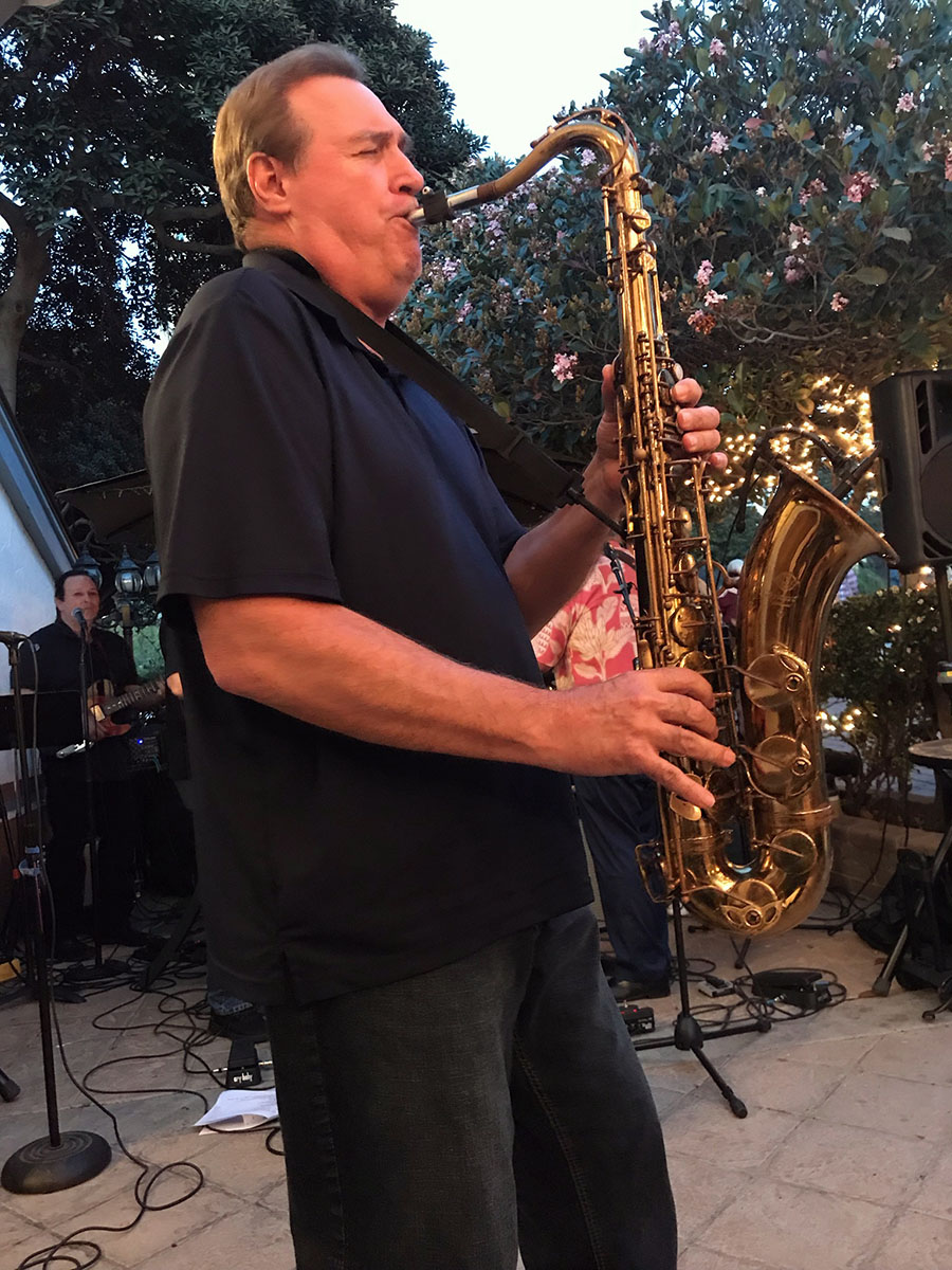 The list of bands Tisch has been in is long and varied, including (my own) True Stories, but also pretty much anyone who asks. If he has the opportunity to make music, he’s going to take it. Tisch is a master improviser, with a no-holds-barred performing style that has resulted in him becoming a favorite at venues throughout the Southland. It’s not unusual to find Tisch blaring sax on a bar table, serenading a couple in the crowd, or joining the audience in dancing and mayhem, all in the quest to give his listeners a good time. “I like interacting with the audience, hopefully it energizes them and brings them further enjoyment,” Tisch said. Amongst the groups he has been a part of are D.A. and the Hitmen, the Kearney Mesa Adult Community Concert Band, the Adelphi University Chamber Orchestra, the Rockaholics Band, the Footloose Band, the Tobasco Brothers, and the Distractions. He has also backed Normandie Wilson and jammed with jazz legends such as Mundell Lowe, Betty Bennett, and Jack Costanzo.