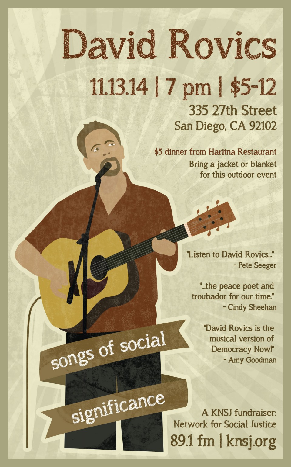 This Thursday, all are welcome to a night of dinner and live music performed by touring artist David Rovics in support of KNSJ 89.1 FM radio station, San Diego’s network for social justice. Rovics is a radical folk singer/songwriter who sings songs of social significance covering various social justice topics.  The Grand Industrial Band, a local act, will be supporting Rovics as the opening act. See full details below!