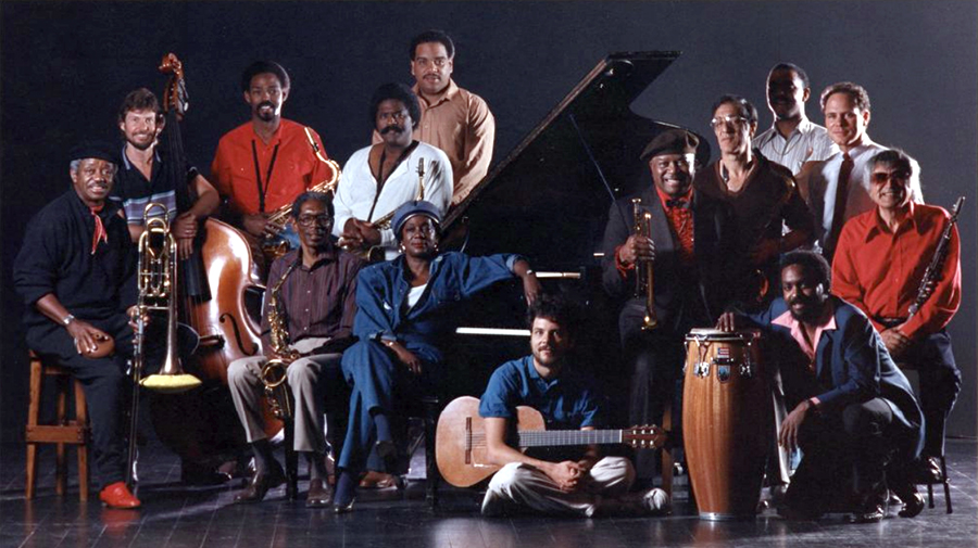 UCSD Jazz Ensemble with Jimmy and Jeannie, Peter Sprague, Gunnar Biggs, Hollis Gentry, Charles McPherson et al, 1980s. Photo: Jimmy and Jeannie Cheatham Collection, University of Missouri Kansas City.
