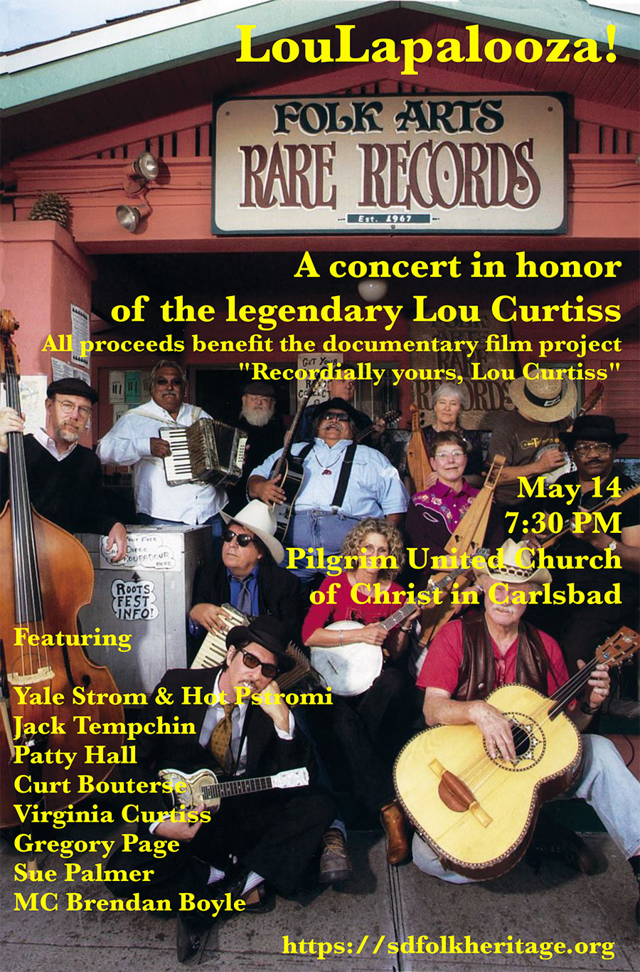 On May 14th, the San Diego Folk Heritage is hosting a benefit concert featuring some of the giants of the San Diego music scene in honor of our own Lou Curtiss. In addition to Yale Strom & Hot Pstromi, the lineup for the evening includes Jack Tempchin, Gregory Page, Sue Palmer, Patty Hall, Curt Bouterse, Virginia Curtiss, Walt Richards… and a few surprises. We’d like to let you know why the late Lou Curtiss is worthy of this event but more, the documentary film, Recordially Yours, Lou Curtiss.