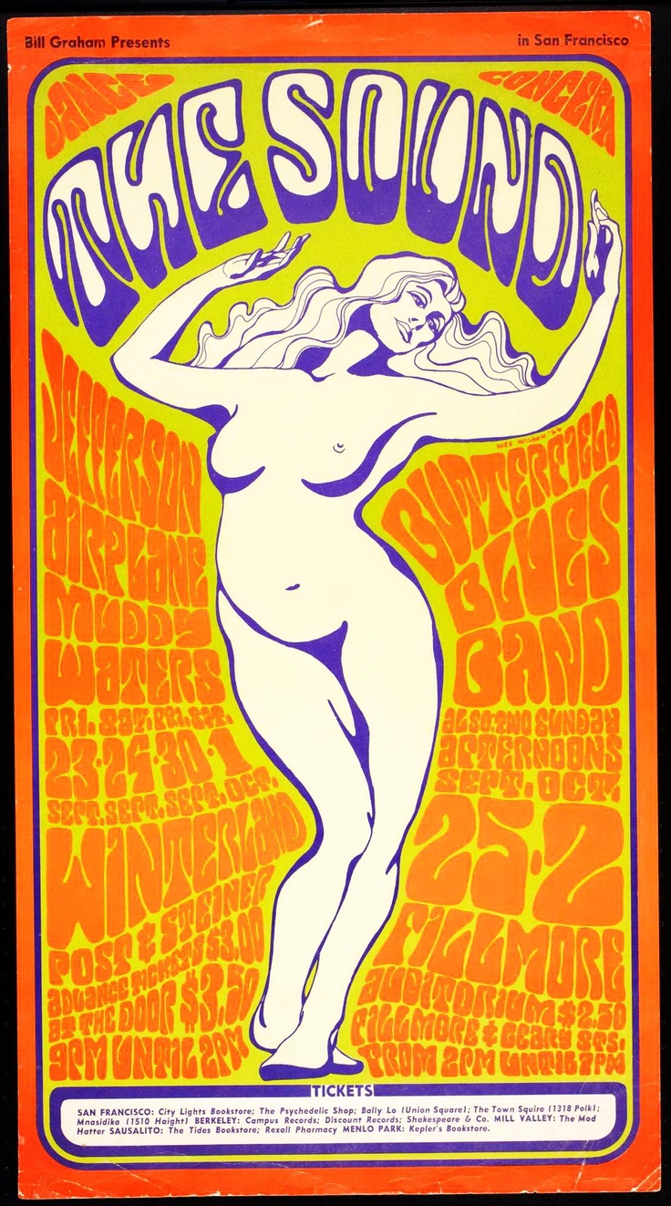Whether sober or intoxicated, to take a gander at the surreal, graphically undulating handbills and posters of the late 1960s, and interpret the amorphous blobs of text (announcing the next series of musical performances at the Fillmore and Avalon ballrooms in San Francisco) is to be immersed in psychedelic culture. And to swim upstream within the electric Kool-Aid current of Stanley Mouse or Rick Griffin’s mystical calligraphy and extract meaning from its perpetual motion requires a special pair of shamanistic goggles: i.e., adopting the role of a fellow visionary.