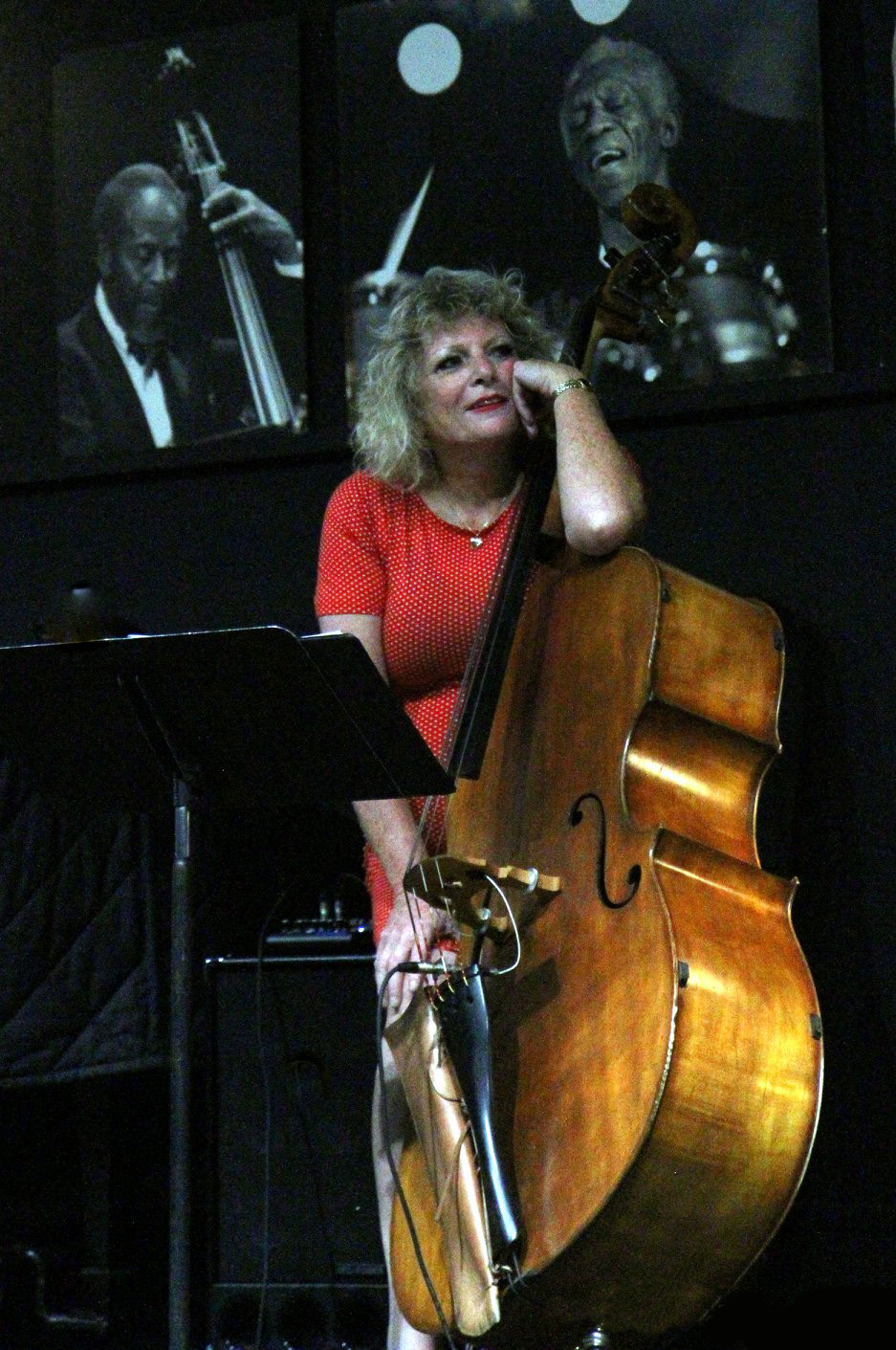 Hill worked cleaning mobile homes and saved up enough money to buy an electric bass and amplifier. “I had a Hangstrom bass and a Supro amplifier,” she says. “The amp was so big and heavy that my dad would have to help me getting it to gigs!” A typical musical enthusiast, she hung out at the local music store, where she found a used upright bass that she was able to buy for $500. Painted completely black, Hill removed the paint to find a very good quality German made bass. The bass remained her main instrument for decades until she replaced it with a high quality bass, one that was custom made for her.