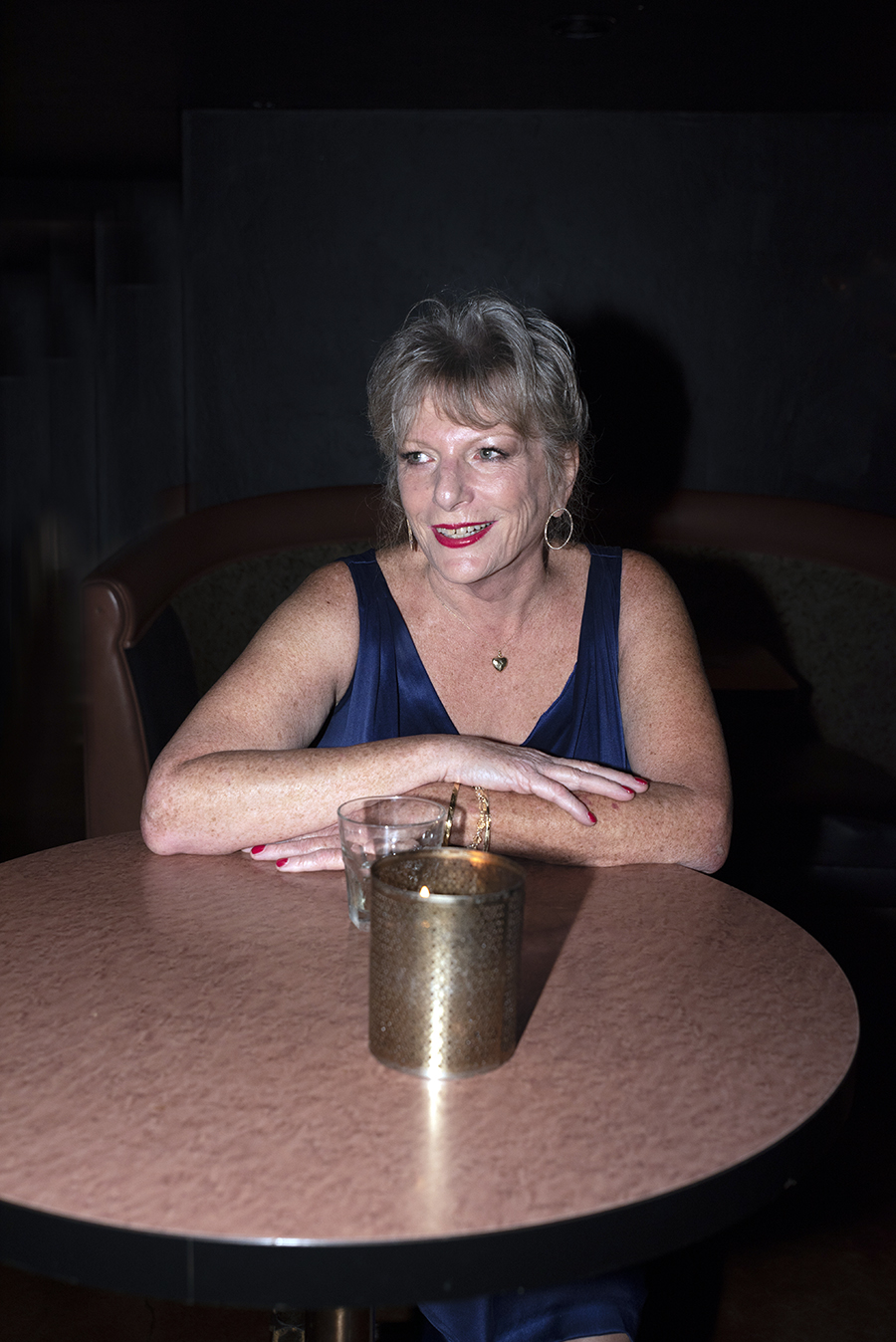 I grab a red sangria and take a seat under the seven of clubs and nine of diamonds. Dressed in a red patterned jumpsuit and center stage is Hill with a five-string electric bass and a mint, totally mint Kustom amplifier. Yes, the kind with the pleated and tucked Naugahyde covers, the really great ones from the seventies. It looks like it just came from the showroom.