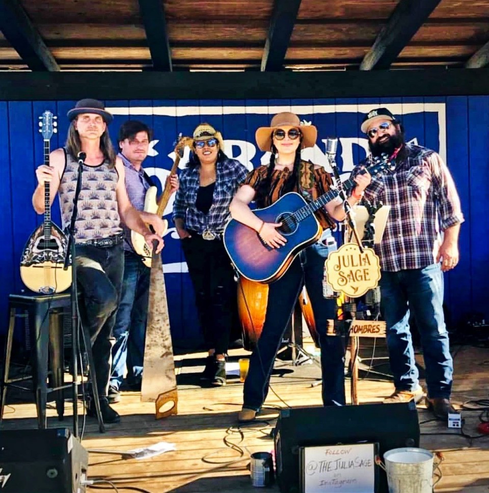 Julia (with guitar) with the Bad Hombres, Drew Douglas (aka Grandpa Drew), Chad Pittman, Natasha Cruz, and Matthew Strachota.