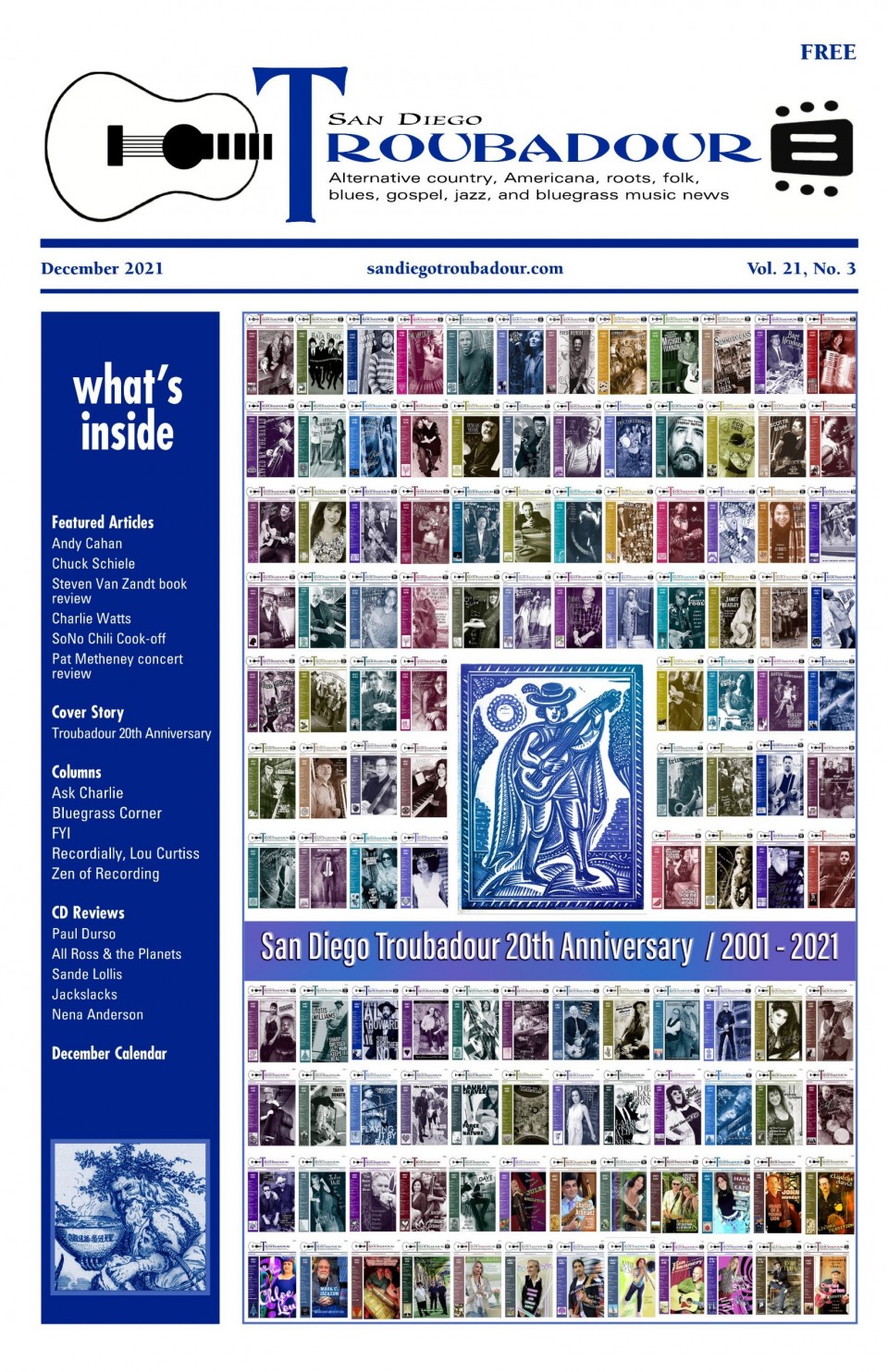 When Liz, along with three others, started the Troubadour it was primarily dedicated to bluegrass and folk music, which I admittedly don’t know much about or have a major interest in. But yet the publication always caught my eye and interest. Even if I wasn’t intimately familiar with whoever was on any given month’s cover, I was aware that this was a publication about roots music in San Diego, and that in and of itself gave me an appreciation for it, since whether it’s bluegrass, folk, country, blues or jazz, in my not so humble opinion, it’s all roots music, as opposed to pop, which is completely on the other side of the cultural spectrum.