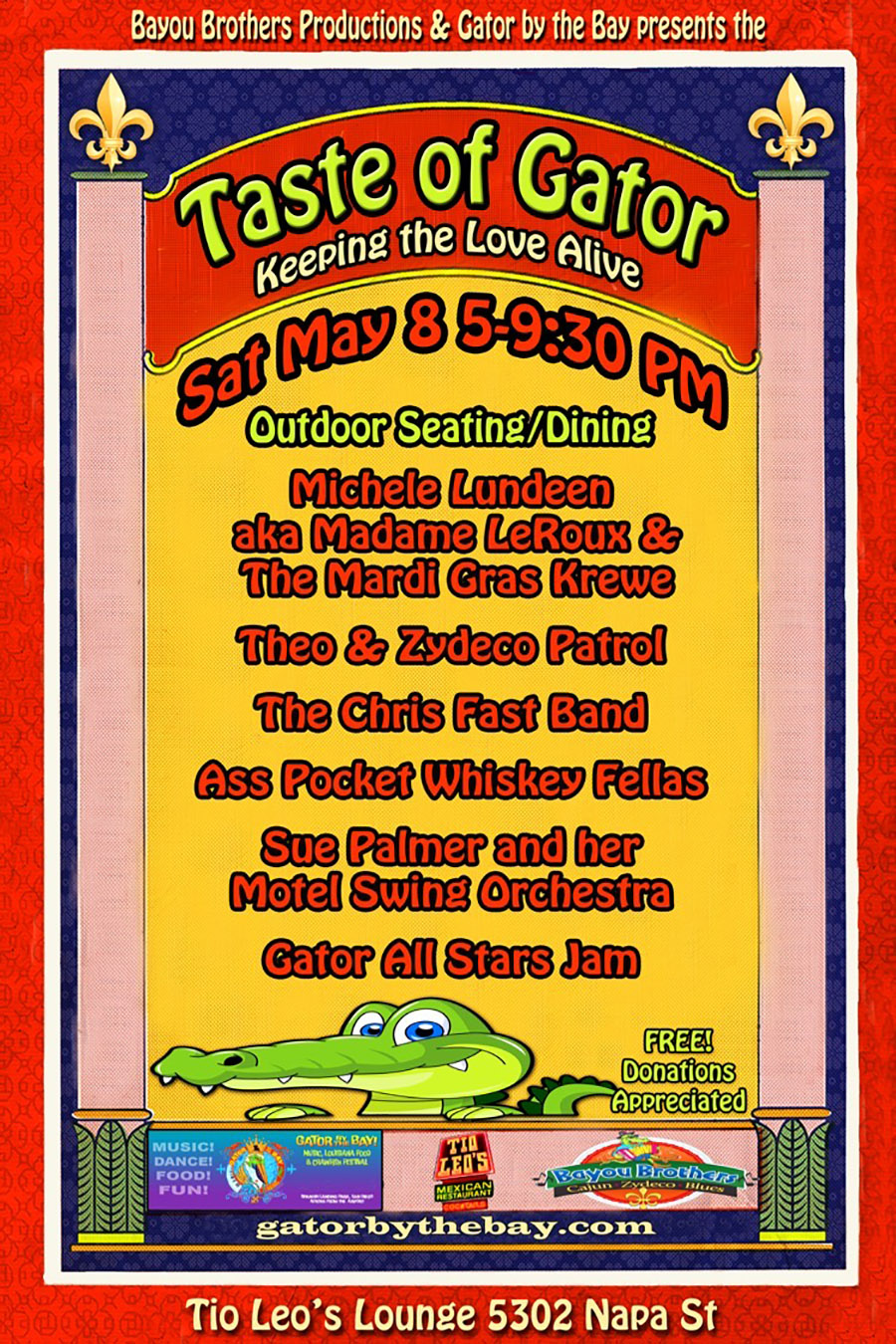 Taste of Gator: Keeping the Love Alive is brought to you by the good folks at Gator by the Bay and Bayou Brothers Productions. All are welcome. Please wear masks (except eating and drinking, of course) and please be Covid polite as we are still in the fight. —Catherine Miller