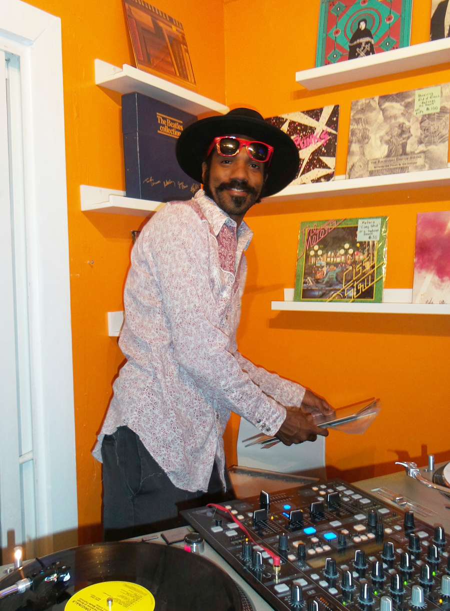 Howard spinning records at the Vinyl Junkies Record Shack grand opening. Photo by Julia Hall McMahon.