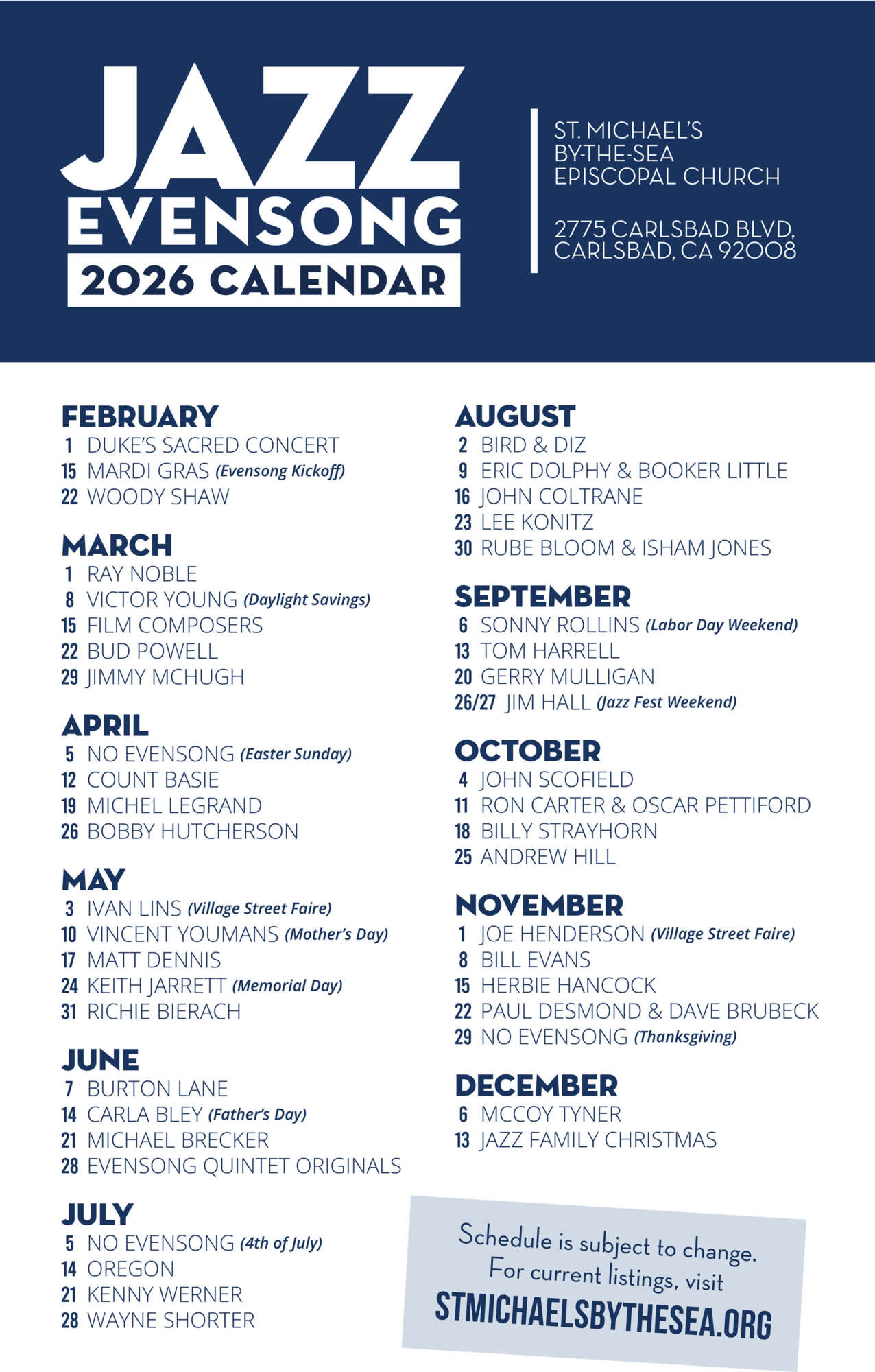 With the exception of a winter break and a few holidays, Jazz Evensong happens each Sunday from 4 to 5:30pm on the church campus along Carlsbad Boulevard, as the coastal highway is known in the city.