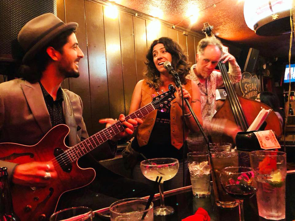With Irving Flores, Charlie Arbelaez, and Julien Cantelm playing a driveway concert during the Pandemic. Photo by Liz Abbott.