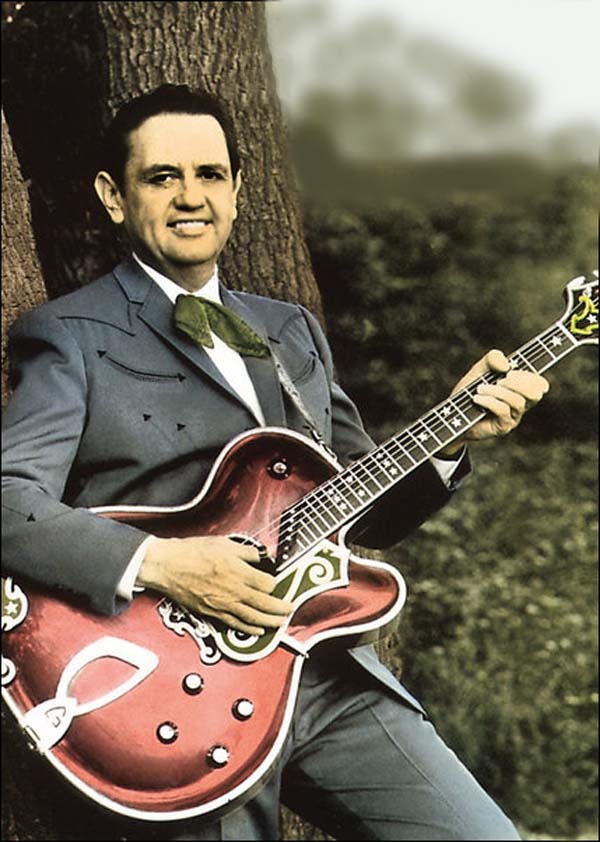 When I saw Tom Boyer up at the Sam Hinton Folk Heritage Festival in June doing some of that thumb pickin’ made famous by all those Kentucky guitarists, it got me to thinking about maybe the most famous of them all: my favorite, Merle Travis. I grew up with Merle’s music starting with some of those old Capitol 78 rpm recordings my dad had, like “Sweet Temptation,” “Dapper Dan,” and a couple of others. When I moved to California in 1952, I was pleased to find out that Merle was all over L.A. television with his own show, with Cliffie Stone’s Hometown Jamboree and then with Town Hall Party. I got to see him in the movie From Here to Eternity and quite a few times at San Diego night spots like the Bostonia Ballroom. I even saw him sit in once with the Maddox Brothers and Rose at a club in National City. Merle saw me so many times that he started to recognize me and as I’m always searching for information, I started to ask questions and make notes. I wrote a couple of pieces about him for a high school journalism class and later did a couple of interviews with him backstage at one of the Town Hall shows. I got my first reel-to-reel (a Sony) tape recorder around 1956 and my second (a Uher, which was a lot more portable) in 1959. Sometime right about then I got Merle to sit down for an interview.