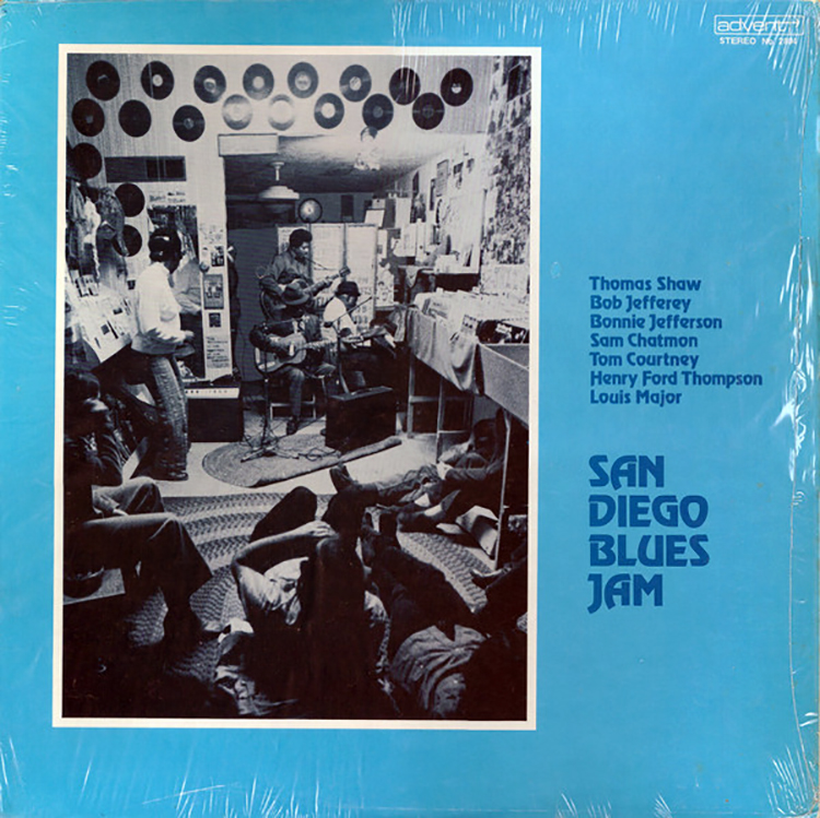 Quite a few people were involved in recording these artists. Chris Strachwitz had recorded Sam long before Ken Swerilas found him. One of the first things I did when Sam came out here was to contact Nick Perls at Yazoo/Blue Goose about recording Sam. An LP on Blue Goose was cut in Ken Swerilas’s living room by John Fahey and myself. With Shaw I contacted Frank Scott to record Shaw playing electric guitar and Nick Perls to record him on acoustic. These LPs appeared on Scott’s Advent Records and Perls’ Blue Goose. I didn’t have as much luck with Bob and Bonnie though. Nick recorded both of them but never released anything. (I wonder now, since Perls’ death, whether his enterprises have been taken over by Richard Nevins and if any of those tapes exist.) He also recorded a second Sam Chatmon album with mandolinist Kenny Hall, which never came out. Frank Scott put out an LP called San Diego Blues Jam (in 1974) that featured Sam Chatmon, Robert Jefferey, Bonnie Jefferson, and Thomas Shaw. It also featured the first recordings of Tomcat Courtney and his then partner Henry Ford Thompson, and West Indian singer guitarist Louis Majors. Shaw also recorded an LP in Holland during his European trip; Sam Chatmon has LPs on Flying Fish, Rounder, Flyright (which includes some live stuff recorded at my store), an Italian label, and a German label that pressed material recorded at his home in Hollendale. Both were LPs.