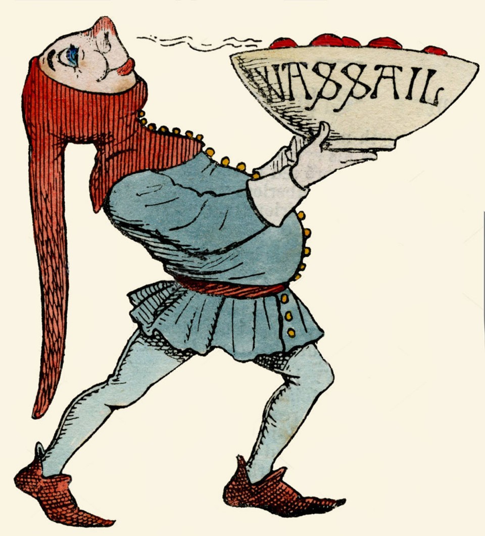 The tradition of singing Christmas carols on the eve of Christmas can be traced to the English tradition called wassailing. From Old English (be hale) wassail was a medieval hot drink (usually cider made from crab-apples, mixed with mead and cinnamon, ginger, and nutmeg). Beginning in the Middle Ages people (often the poor peasantry) went from door to door during Yuletide, drinking from a wassail bowl and singing songs. The word wassailing today has been displaced by caroling. People went wassailing to homes in exchange for gifts and others went to the orchards where cider was produced where they sang away the evil spirits and beseeched the trees to provide an ample harvest in the coming year. This custom was performed primarily in the cider-producing west of England (primarily the counties of Devon, Somerset, Dorset, Gloucestershire, and Herefordshire). Wassailing was a crucial part of Jersey, Channel Islands’ local winter solstice traditions, because before the twentieth century most of the local economy came from the sale of cider. Here is an old rhyme that was sung in the orchards on Jersey in Jerriais, the form of the Norman language spoken off the west coast of France.