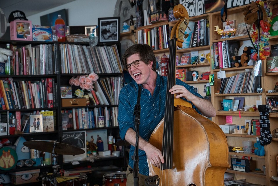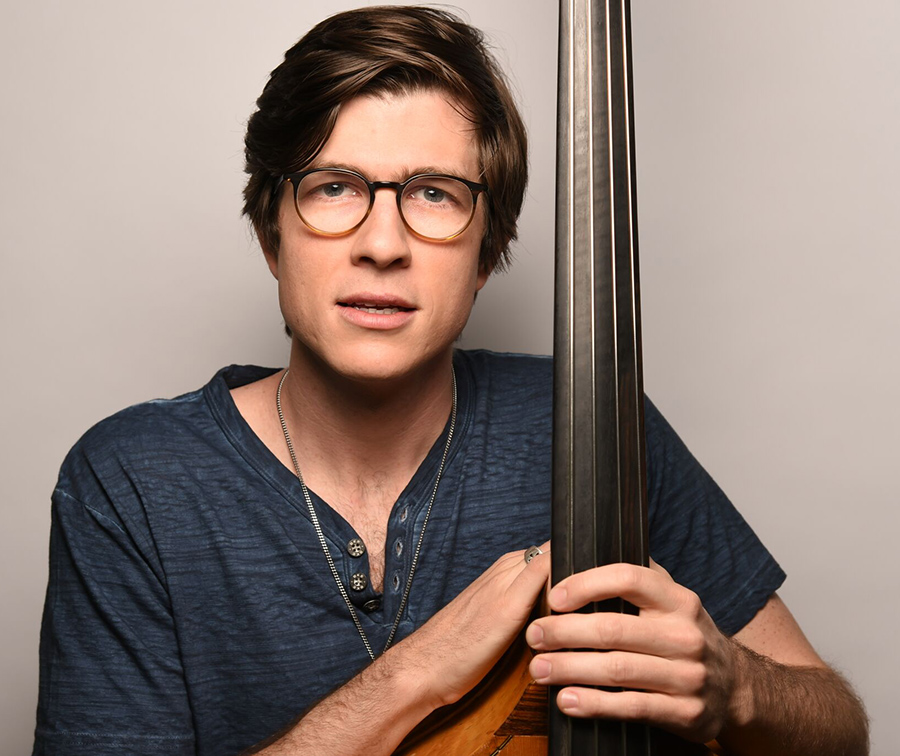 Scott Mulvahill plays a quick triplet that drops down to a low note on his bass. The sound is loose and growly. His right hand makes contact with the ebony fingerboard, producing a sharp slap; he then raps on the body of the bass. He plays a high note, sliding it up and letting it ring out. The timbre is resonating and the bass and slaps make a rich mix of rhythm and melody line.