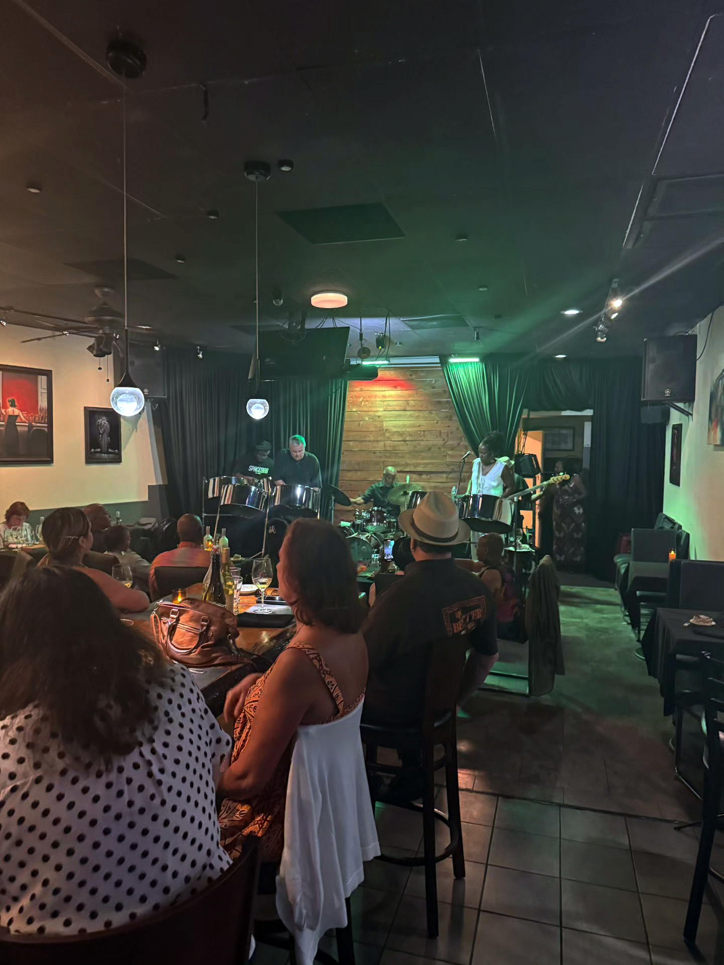 Frank begins to list the expansive mix of entertainment they have every week. “On Mondays, we got Latin jazz.” That’s the ten-piece band Los Maniacos led by trumpet player Bill Caballero, who played with San Diego-based Joe Garrison’s ensembles, including Night People. In addition to trumpet, the lineup onstage includes guitar, electric bass, keys, two trombones, sax, congas, percussion, drums—sometimes with vocalists. This is a well-attended event; the room is dimly lit and the atmosphere buzzes. There is a disco light flashing frantically on a table near the stage. The band adeptly raises the roof.