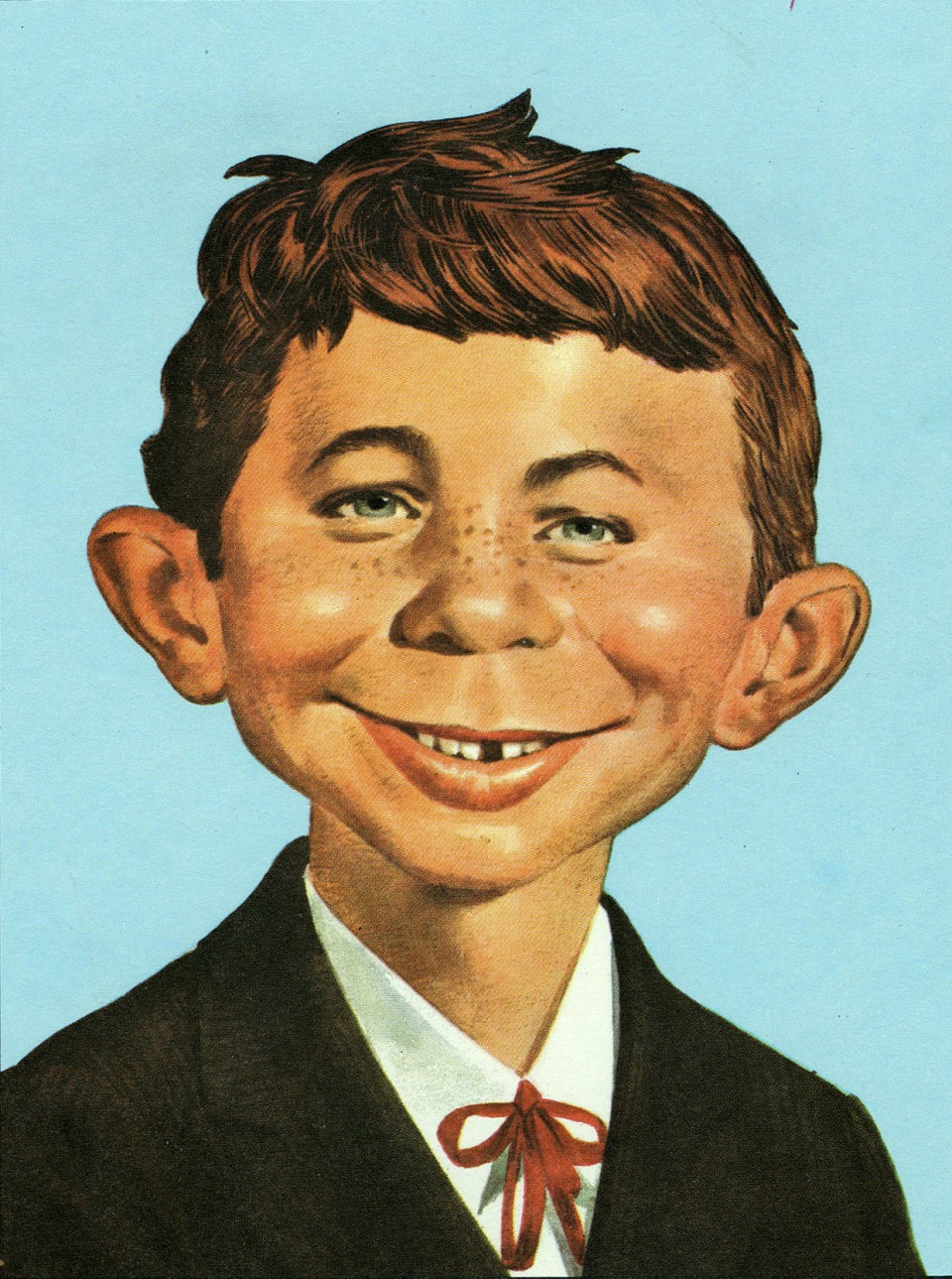 On the cover was a redheaded kid. His hair, haphazardly clipped, went this way and that. His ears flew out from his head, and his eyes were too far apart and pleasantly sleepy. And there was the grin with the lost tooth. It all spelled stupid, yet somehow in my nine-year-old mind I still got it that this kid, Alfred E. Neuman, was also clued in. In school, he would have been grouped in with the slow learners. All the teachers and parents would have thought him a zero, but he would have also been the kid who knew how to get the illegal firecrackers and knew where his father hid his Playboy magazines.