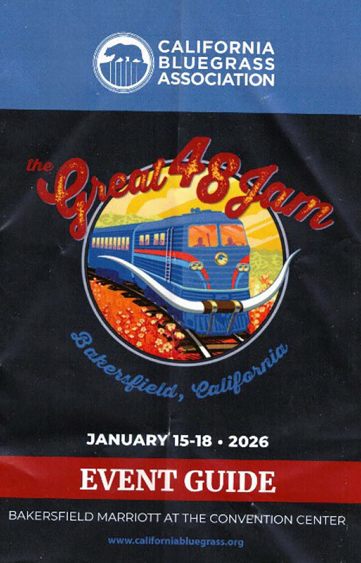 Over the weekend of January 15-18, the bluegrass tribe gathered at the Marriott Hotel in downtown Bakersfield for the annual Great 48 event. There were folks from the San Diego Bluegrass Society and the North San Diego County Bluegrass and Folk Club, as well as pickers from Los Angeles, central California, and the northern reaches, and from out of state. Some rode into town on a train with on-board bluegrass jamming.
