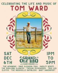 A memorial celebration for Tom Ward will be held at the Grand Ole BBQ in Flinn Springs on Saturday, December 6, starting at 1pm.