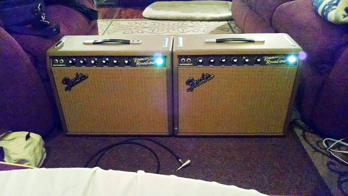 The Princeton was part of a limited edition of 200 amplifiers. I bought the first one locally from a dealer that was going out of business. It was so cool that I started looking for another one to go with it. I found another one at a store in Los Angeles that was ironically also going out of business. (No, they aren’t consecutive serial numbers, but how cool would that be?) I could get both Princetons, an electric guitar, an acoustic guitar, and my pedalboards and cables into the trunk of the Mustang. I thought I was set. But I soon found another Princeton that was a special-order configuration for Sweetwater, and I had to have that one too… I also acquired four more electric guitars and three baritone guitars. So much for limiting my gear. I remember playing a gig where I brought one acoustic guitar, two electric guitars, a baritone guitar, one Princeton, my acoustic amplifier, and two pedalboards. I had to put the acoustic guitar in the front seat and the baritone in the back seat. As I was loading my gear into the car after the gig, I realized I was right back where I started three years prior but with less room to carry things. This was stupid…