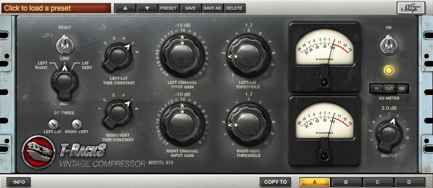 Both are emulations of real world hardware and I was lucky enough to use the Shadow Hills unit at Ranch Bernardo’s Studio West on multiple occasions, where I subsequently fell in love with it. Most noteworthy about the Shadow Hills is the fact that it has two compressors in its signal path: The first compressor in the circuit is an optical attenuator. The second compressor is a discrete VCA type. By design, the second compression stage “finishes the job started by the Optical Section,” with each compressor gently “kissing” the signal in an effort to invisibly glue the mix together. But the really remarkable feature for me was the final processing stage, with three selectable output transformers: Nickel (cleanest position with the least distortion, with accentuated ultra-highs), Iron (adds even-ordered harmonic distortion, which makes things “fatter”) and Steel (even more distortion and a tight boost in the lows). This is the Class A version, also known as the Mogami Edition. It’s based upon a special limited batch they made with an updated Class-A discrete compressor section, Lundahl input transformers and hand-wired each compressor with Mogami cables. Compared to the other compressors listed here, this one is the most comparable to flying a helicopter; but once you get the hang of it, it is pure magic.